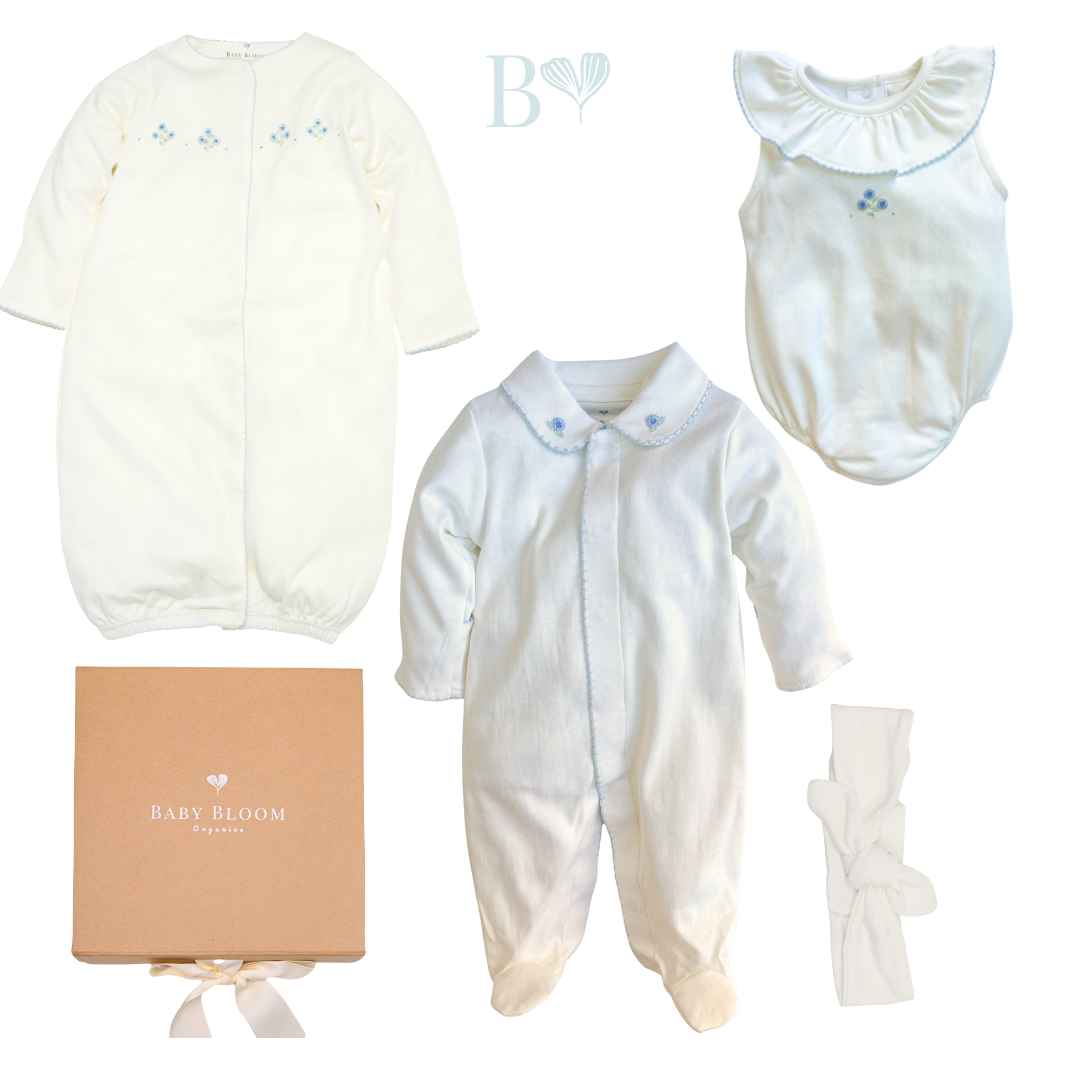 Our Baby Girl Gift Set Bundle Peonias Blue is a beautifully curated collection designed to celebrate your little one with timeless elegance, handcrafted embroidery, and the unmatched softness of 100% Organic Peruvian Pima Cotton. Every piece is made with tag-free construction to protect your baby’s delicate newborn skin.