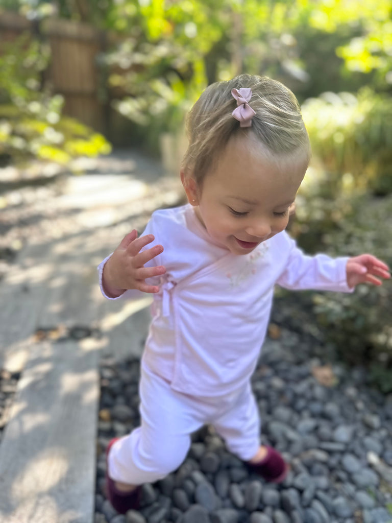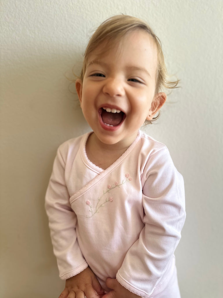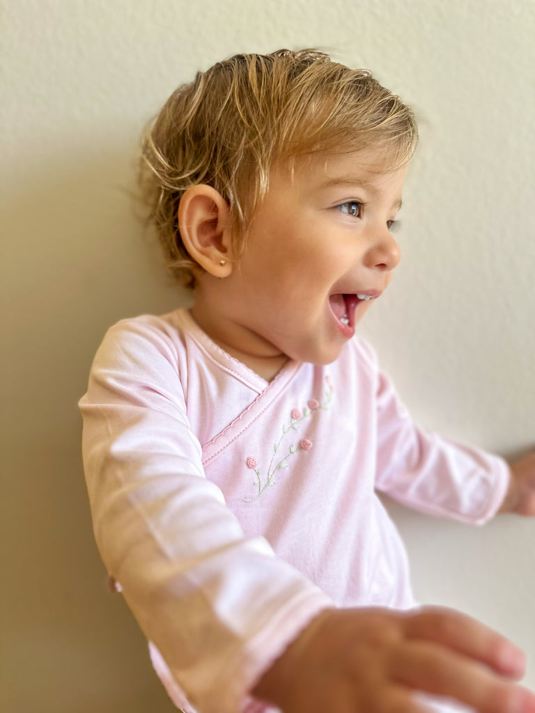 Our Pima Kimono Set in Rose Pink is a timeless newborn essential, crafted from the world'ss softest Peruvian Pima cotton. The wrap-style kimono top is gentle on baby's skin and easy to dress, while the matching bottoms feature a soft elastic waistband for comfort. The delicate ruffle collar is hand-embroidered with three tiny roses, inspired by our signature Rose Footie. Designed label-free to avoid irritation, this heirloom-quality set is perfect for take-me-home outfits, baby showers, or everyday elegance.